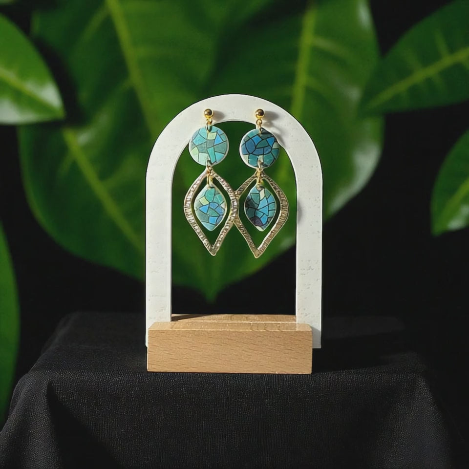 Indulge in the lavish elegance of Grace. Our exclusive design features a stunning mosaic of blue and green hues, accented by luxurious gold embellishments. Elevate your style with this sophisticated piece, reminiscent of a work of art.